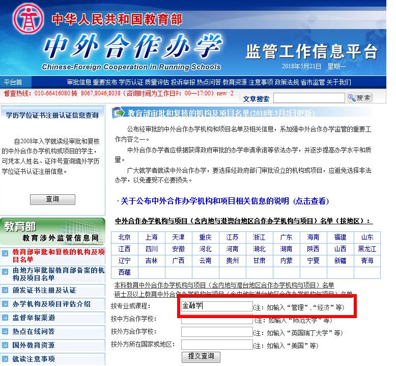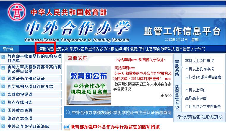 1.登錄“中華人民共和國教育部 中外合作辦學監管工作信息平臺官網”查詢