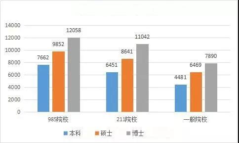 通過以上的數據可以看出:博士比碩士平均高2000元左右,碩士比本科平均高2000元左右;同時,985、211、一般高校的薪資也是有差距的,985高校起薪略高于211高校,平均差別為1000元左右,211高校和一般院校之間的差距平均在2000元左右。