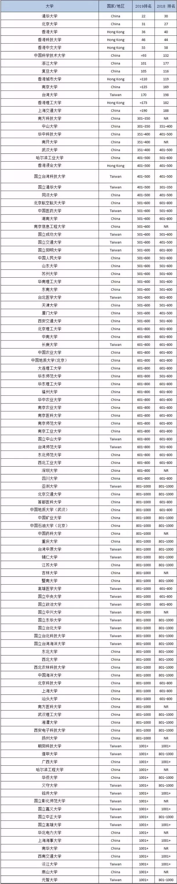泰晤士高等教育2019年入圍的中國高校
