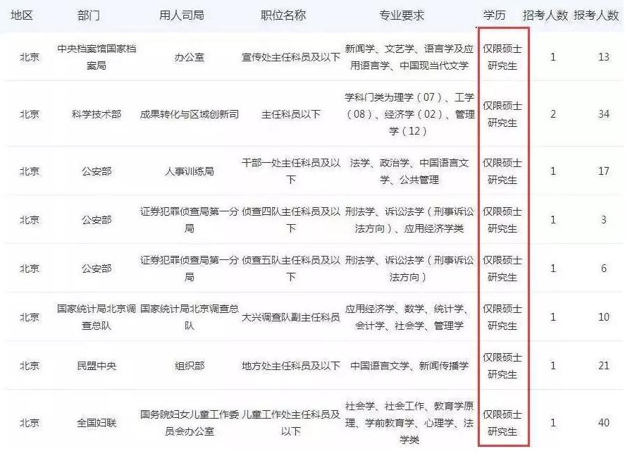 由圖可知,很多部門職位明確要求是碩士研究生,低于這個學歷學位沒有資格報考。