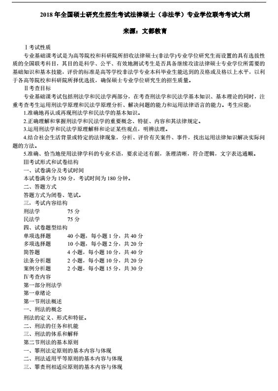 2018年非全日制研究生法律碩士(非法學)專業學位考試大綱已經公布,詳情如下: