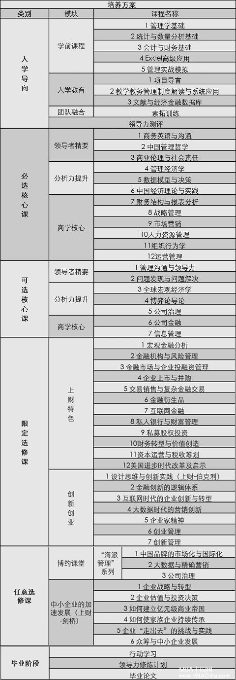 上海財經大學EMBA項目希望幫助學生在其職業生涯的黃金階段向其職業成就的頂峰發起沖擊,為此需要幫助學生樹立高尚而堅定的商業道德、建立豐富而堅實的知識基礎、掌握正確而有效的思維方法、明確專注而擅長的領域方向、搭建持續而有益的學習社交平臺。為了實現上述目的,EMBA項目將全部課程可分為基礎課和專業方向課兩大部分——其中基礎課包括導引、領導者精要、數量分析基礎和商學核心四大模塊;專業課方向課包括國際商務、品牌與戰略、創業與創新管理、公司金融、銀行與金融機構、宏觀與國際金融和投資管理七大模塊。移動課堂、創業與社會責任項目等實踐教學也被內化到培養方案中去。