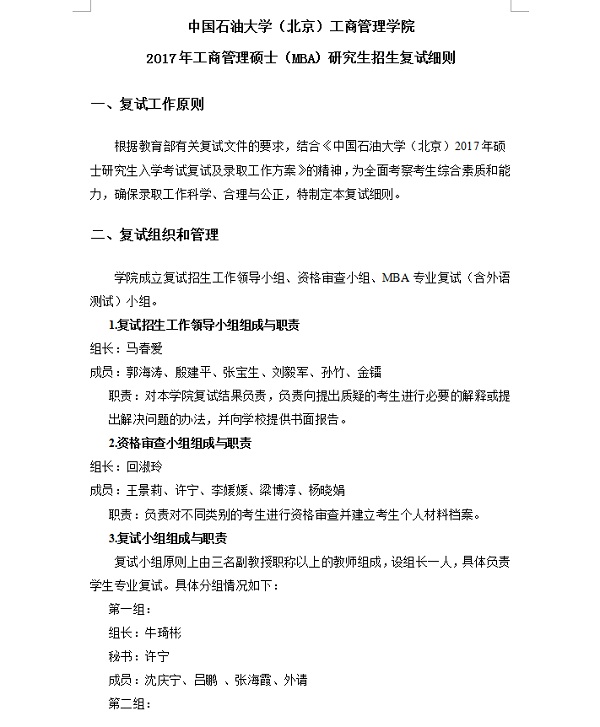 2017年中國石油大學(北京)MBA復試信息,詳情如下: