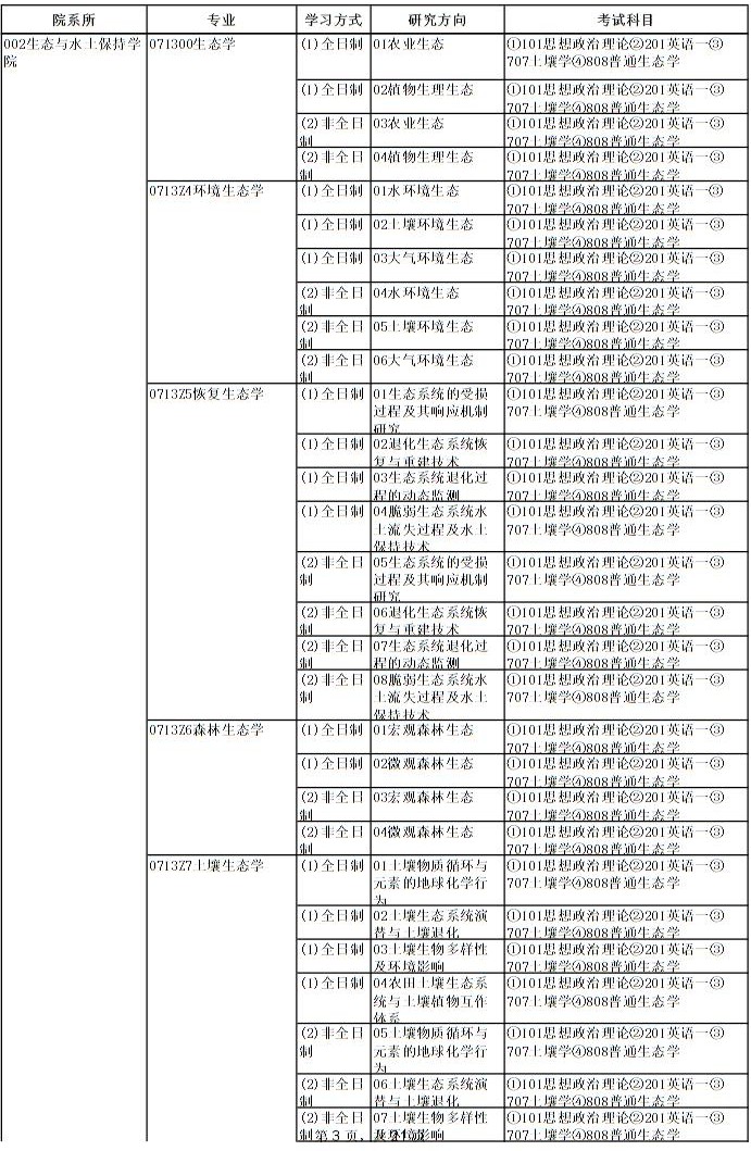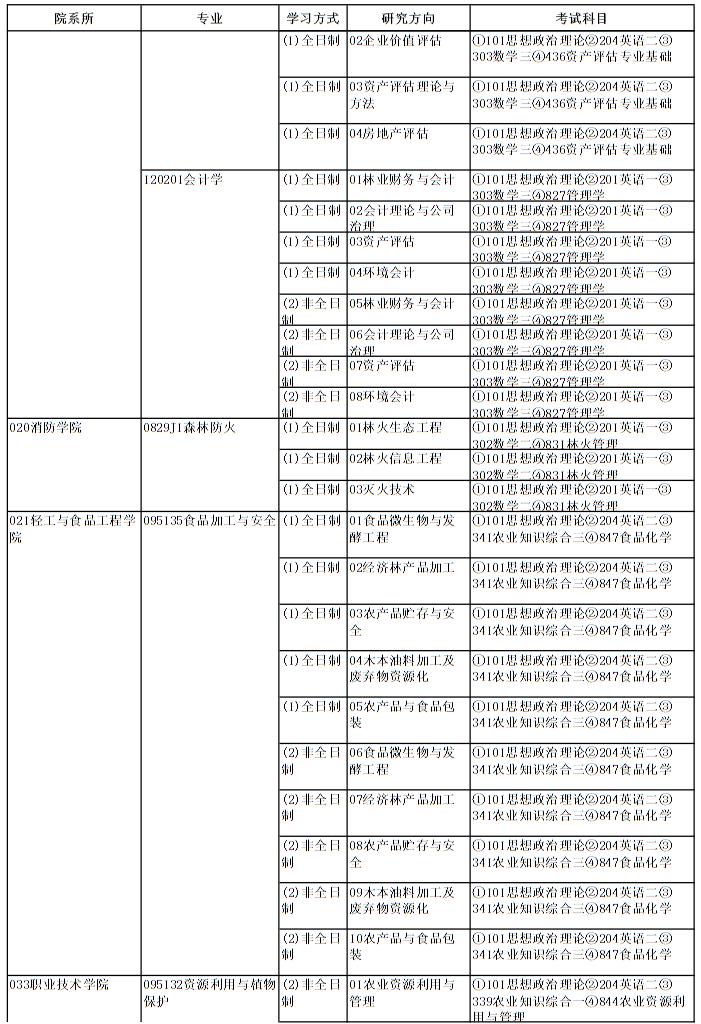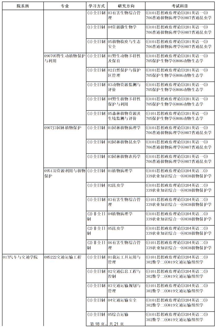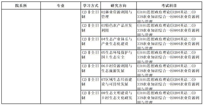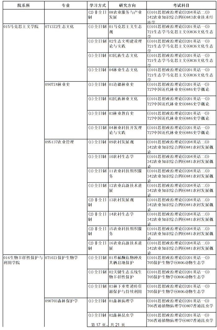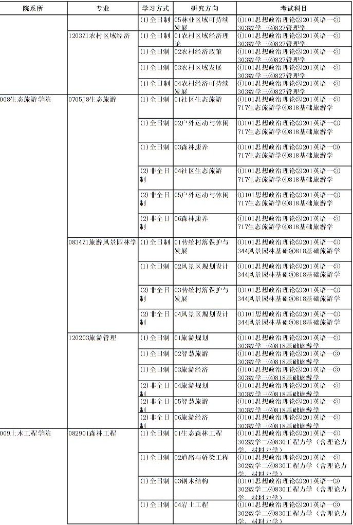 | 001林學院 | 095400林業 | 2)非全日制 | 08自然保護區與森林植物 | ①101思想政治理論②204英語二③345林業基礎知識綜合④804森林培育學 |