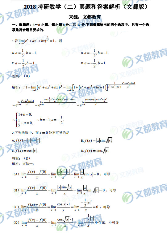 2018年非全日制研究生全國統一初試考試數學二真題及參考答案(完整版),詳細內容如下: