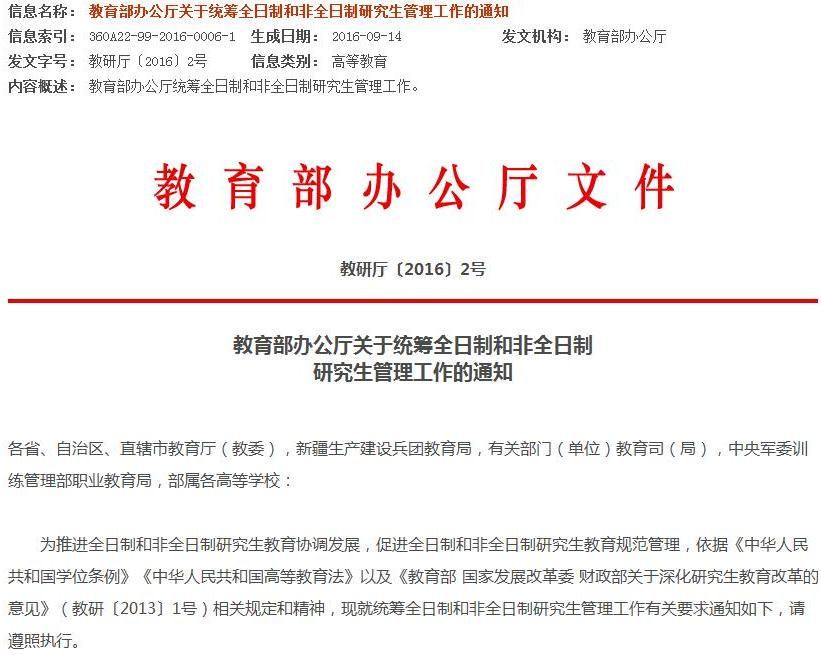 根據國務院學位委員會辦公室印發《教育部辦公廳關于統籌全日制和非全日制研究生管理工作的通知》中明確指出,將以非全日制研究生教育形式納入國家招生計劃和全國碩士研究生統一入學考試管理,從2016年12月1日后錄取的研究生從培養方式上按全日制和非全日制形式區分。