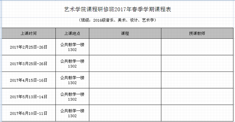人大在職研究生藝術學院2016級課程研修班2017年春季學期授課時間已經確定,具體安排安排如下: