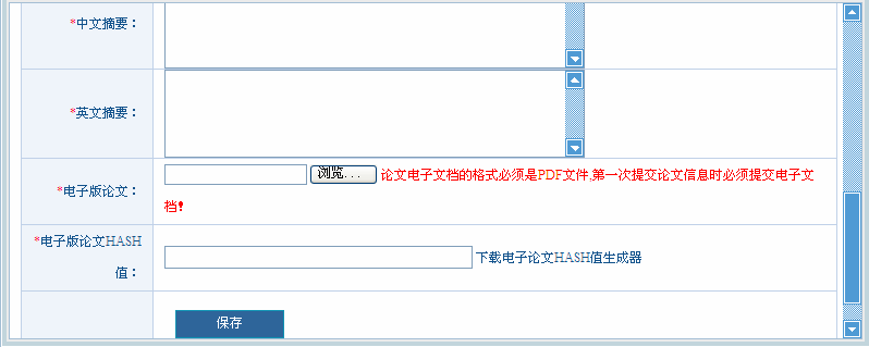 登錄后,選擇上傳論文信息菜單,按頁(yè)面提示填入信息即可。上傳的論文要求是PDF格式,并將論文Hash校驗(yàn)器下載另存到本機(jī),生成Hash校驗(yàn)值,填入頁(yè)面,點(diǎn)擊保存。最后顯示“電子文檔已上傳”,即為成功。