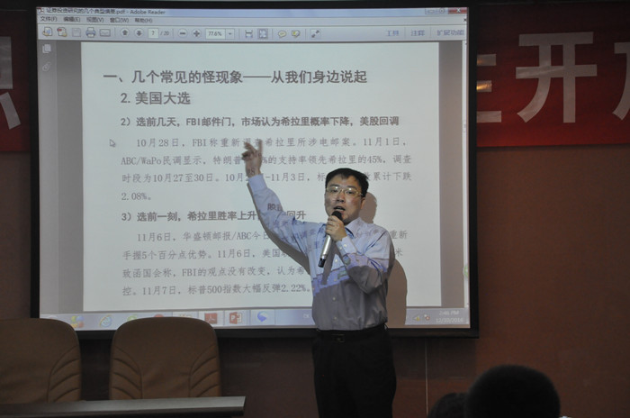 李少君博士從學(xué)生們耳熟能詳?shù)慕谫Y本市場重要事件入手,深入淺出地講解了證券投資分析的基本邏輯和方法。他首先以英國脫歐公投、美國大選等事件為切入點(diǎn),激發(fā)大家思考資本市場定價(jià)反應(yīng)背后的邏輯;隨后引申到基礎(chǔ)的定價(jià)模型,詳細(xì)地解釋了股價(jià)偏差產(chǎn)生的原因并從技術(shù)分析、基本面分析以及量化分析三個(gè)方面介紹了金融理論與證券投資研究的關(guān)系。