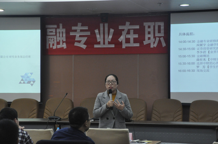 2016 年12月10日下午,由中央財(cái)經(jīng)大學(xué)金融學(xué)院主辦的中財(cái)在職研究生金融專業(yè)在職研修班招生開放日活動(dòng)在我校學(xué)術(shù)會(huì)堂706成功舉行。金融學(xué)院副院長應(yīng)展宇教授,業(yè)界導(dǎo)師民生證券研究院副院長、研究業(yè)務(wù)部總經(jīng)理李少君博士,金融學(xué)院商有光副教授以及在讀學(xué)生代表羅芳同學(xué)受邀參加了此次活動(dòng)并發(fā)表了精彩演講。